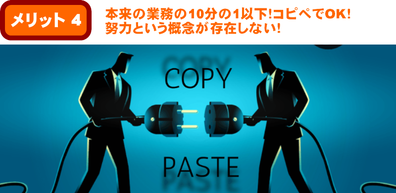 その効率性は、従来のアフィリエイトの10分の1以下!本来では考えられないレベルの作業性が実現されています。
